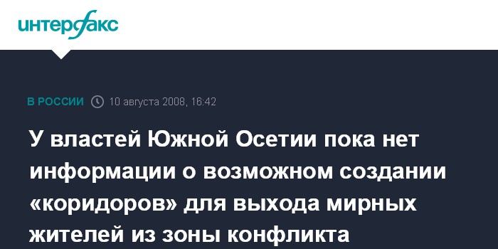 Цхинвали. 10 августа. INTERFAX.RU - Власти Южной Осетии не располагают данными о том, что к вечеру воскресенья могут быть созданы так называемые "коридоры" для выхода из зоны конфликта мирных граждан.