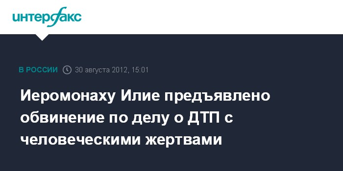 Москва. 17 августа. INTERFAX.RU - Иеромонаху Илие (Павел Семин), ранее арестованному в рамках дела о ДТП, унесшем жизни двоих человек на Кутузовском проспекте, предъявлено обвинение по части.5 ст.264(нарушение ПДД, повлекшее смерть двух и более лиц), сообщил "Интерфаксу" источник в правоохранительных органах.