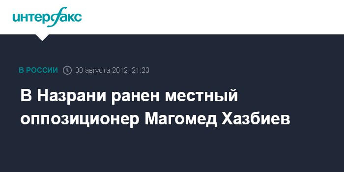 Назрань. 30 августа. INTERFAX.RU - В республиканскую клиническую больницу в Назрани в четверг вечером с огнестрельным ранением был доставлен известный ингушский оппозиционер Магомед Хазбиев.