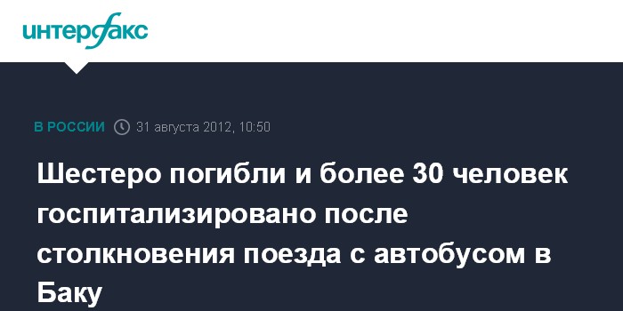 Баку. 31 августа. INTERFAX.RU - В пятницу утром в бакинском поселке Локбатан рейсовый автобус столкнулся с поездом. Как сообщил агентству "Интерфакс" пресс-секретарь Минздрава республики Анар Гадирли, в рзультате аварии погибло шесть человек, 33 человека госпитализировано, из них восемь находятся в тяжелом состоянии.