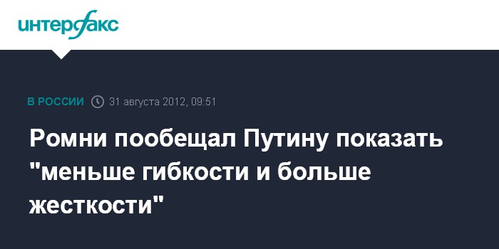 Вашингтон. 31 августа. INTERFAX.RU - Кандидат от Республиканской партии в президенты США Митт Ромни обещал в случае его избрания на пост главы государства ужесточить политику Соединенных Шатов в отношении России.
