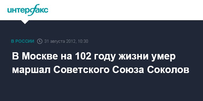 Москва. 31 августа. INTERFAX.RU - Маршал Советского Союза Сергей Соколов скончался в Москве на 102-м году жизни, сообщил "Интерфаксу" в пятницу руководитель аппарата Клуба военачальников РФ Николай Дерябин.