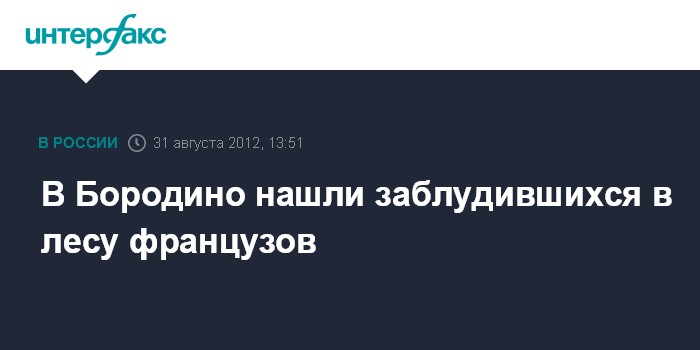 Москва. 31 августа. INTERFAX.RU - Пять французских туристов потерялись в районе Бородинского поля, где на днях отметят 200-летие Бородинского сражения в 1812 году между русской и французской армиями. Но в итоге французы нашлись сами, хотя к их поискам уже подключилось МЧС.
