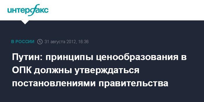Ново-Огарево. 31 августа. INTERFAX.RU - Президент РФ Владимир Путин поставил кабинету министров задачу утвердить правила ценообразования в отношении продукции военного назначения.