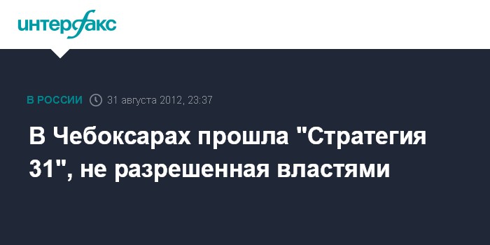 Чебоксары. 31 августа. ИНТЕРФАКС-ПОВОЛЖЬЕ - Митинг в защиту свободы собраний "Стратегия 31", не согласованный администрацией Чебоксар, но разрешенный судом, прошел в столице Чувашии в пятницу.
