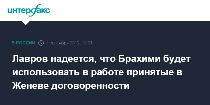 Москва. 1 сентября. INTERFAX.RU - Глава МИД РФ Сергей Лавров рассчитывает, что новый спецпосланник ООН и ЛАГ по Сирии Лахдар Брахими воспользуется в своей работе положениями, зафиксированными в Женевском коммюнике от 30 июня.