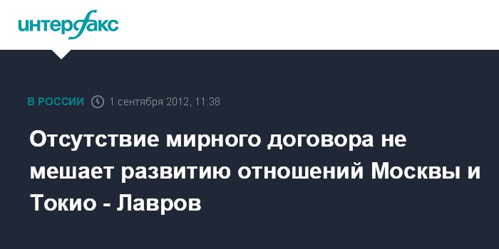 Москва. 1 сентября. INTERFAX.RU - Отсутствие мирного договора между Россией и Японией не является препятствием для развития отношений между двумя странами, заявил глава МИД РФ Сергей Лавров. "Мы не видим сейчас каких-либо препятствий для развития наших отношений даже в отсутствие мирного договора", - сказал он, выступая перед студентами МГИМО в субботу. "В конце концов, есть Декларация 1956 года, которая, по сути дела, возобновила отношения между нашими странами", - продолжил он.