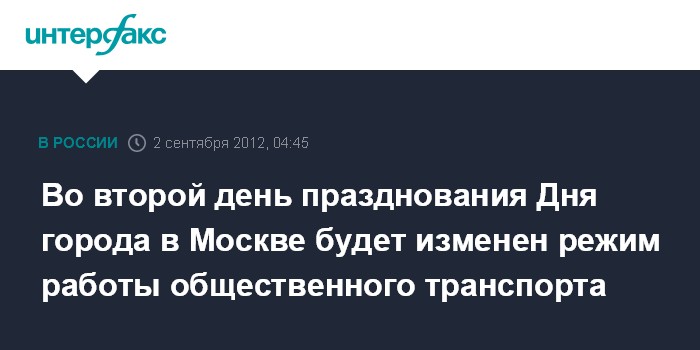 Москва. 2 сентября. ИНТЕРФАКС-МОСКВА - Проводимые в воскресенье второй день подряд праздничные мероприятия, посвященные дню Москвы, вновь, как и в субботу, внесут коррективы в работу общественного транспорта.