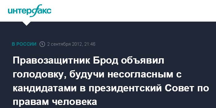 Москва. 2 сентября. INTERFAX.RU - Правозащитник Александр Брод объявил голодовку в знак несогласия с тем, как прошел подбор кандидатов на вакантные места в президентском Совете по правам человека (СПЧ).