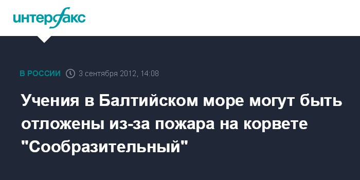 Москва. 3 сентября. INTERFAX.RU - Пожар, возникший на корвете Балтийского флота "Сообразительный" в воскресенье, не позволит ему принять участие в международных военно-морских учениях "Данекс-2012", которые планировалось провести в акватории Балтийского моря с 3 по 12 сентября, сообщили "Интерфаксу" в понедельник в Главном штабе ВМФ.