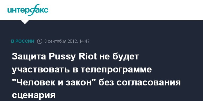 Москва. 3 сентября. INTERFAX.RU - Защита участниц Pussy Riot обуславливает возможность своего участия в телепрограмме "Человек и закон" предварительным согласованием сценарного плана. Об этом сообщил "Интерфаксу" адвокат Николай Полозов.