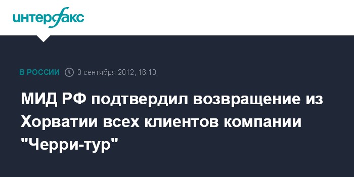 Москва. 3 сентября. INTERFAX.RU - Все российские туристы, застрявшие в Хорватии в результате действий туркомпании "Черри-тур", в воскресенье были отправлены в Россию, заявили в МИД РФ.