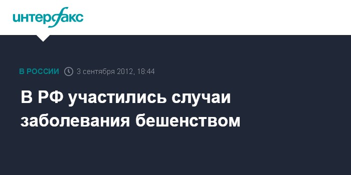 Как сообщает Россельхознадзор, в первом полугодии 2012 года в России на территории 62 регионов зарегистрировано 945 вспышек бешенства. Наибольшее число случаев - в Центральном федеральном округе (52% от всех случаев), Приволжском (17%), Уральском (8%), Южном (7%) и Сибирском (7%).