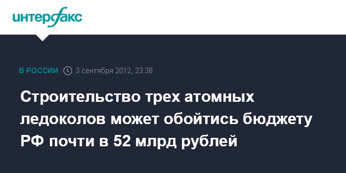 Москва. 3 сентября. INTERFAX.RU - Строительство трех атомных ледоколов мощностью по 60 МВт может обойтись федеральному бюджету РФ в 2012-2015 годах в 51,8 млрд рублей, следует из материалов правительственной комиссии по бюджетным проектировкам, с которыми ознакомился "Интерфакс".
