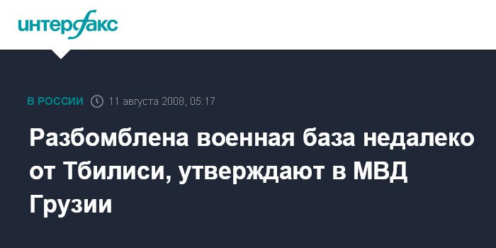 Тбилиси. 11 августа. INTERFAX.RU - Российская авиация в 4:30 утра понедельника нанесла бомбовый удар по военной базе Минобороны Грузии в Коджори (недалеко от Тбилиси), утверждают в Министерстве внутренних дел республики. Как заявили "Интерфаксу" в министерстве, по предварительным данным, пострадавших нет. Между тем агентство не располагает комментарием российского военного ведомства по этому поводу.