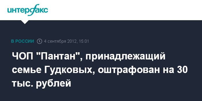 Москва. 4 сентября. INTERFAX.RU - Арбитражный суд Москвы приговорил ЧОП "Пантан", принадлежащий семье депутата Госдумы Геннадия Гудкова, к штрафу 30 тыс. рублей.