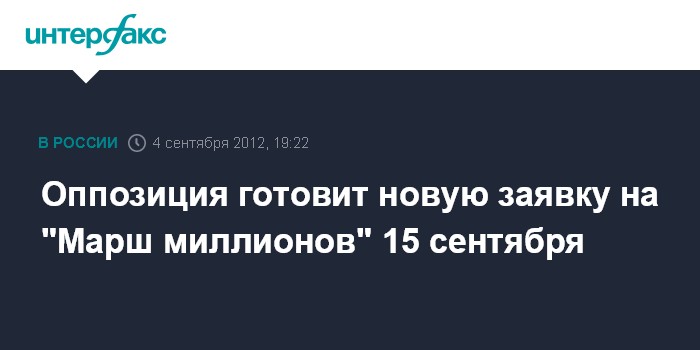 Ранее власти Москвы отказали оппозиции в проведении 15 сентября "Марша миллионов" от Белорусского вокзала по Тверской улице до Боровицких ворот в связи с тем, что заявитель Сергей Давидис имеет два административных правонарушения в течение года.