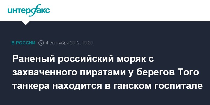 Йоханнесбург. 4 сентября. INTERFAX.RU - Раненый российский моряк с пострадавшего от действий пиратов танкера Energy Centurion попал в госпиталь на юге Ганы, сообщило посольство РФ в Гане на своей страничке в Twitter.