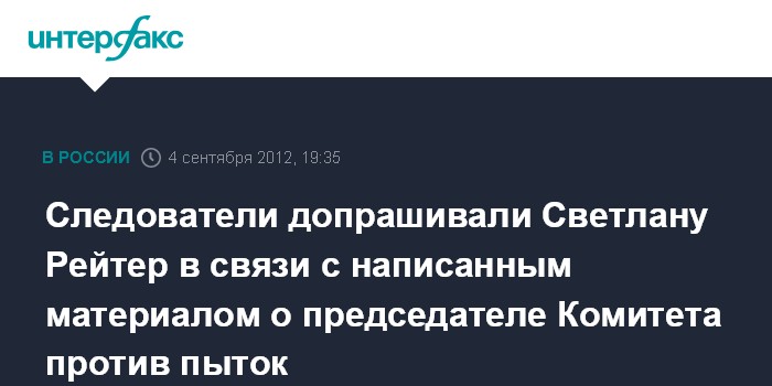Москва. 4 сентября. INTERFAX.RU - Корреспондент журнала Esquire Светлана Рейтер сообщила, что ее допрос в ФСБ был связан с написанной статьей, в которой фигурировали заявления председателя Комитета против пыток Игоря Каляпина.