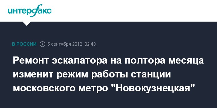 Москва. 5 сентября. ИНТЕРФАКС-МОСКВА - С 5 сентября по 23 октября изменится режим работы станции "Новокузнецкая" Замоскворецкой линии Московского метрополитена, сообщили "Интерфаксу" в пресс-службе метро.
