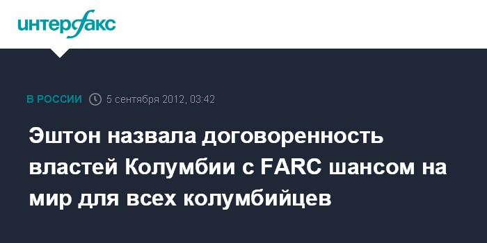 Брюссель. 5 сентября. ИНТЕРФАКС - Верховный представитель ЕС по внешней политике Кэтрин Эштон положительно оценила соглашение правительства Колумбии с мятежниками из Революционных вооруженных сил Колумбии (FARC) о начале переговоров об урегулировании конфликта.