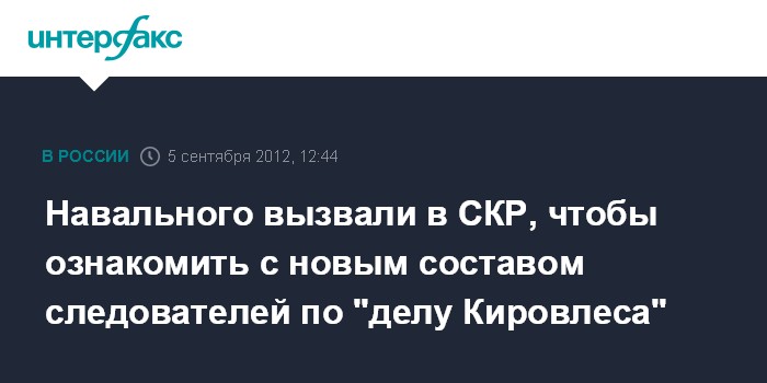 Москва. 5 сентября. INTERFAX.RU - Основатель Фонда по борьбе с коррупцией, оппозиционер Алексей Навальный был вызван в среду в Следственный комитет для ознакомления с новым составом следственной группы по "делу Кировлеса".