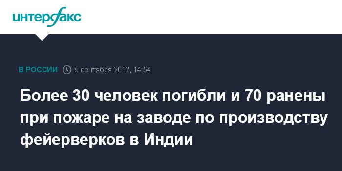 Дели. 5 сентября. INTERFAX.RU - В результате пожара на заводе по производству фейерверков в индийском штате Тамилнад на юге страны погибли более 30 человек и 70 ранены, сообщил в среду интернет-сайт индийской газеты "Хиндустан таймс".
