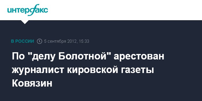 Москва. 5 сентября. INTERFAX.RU - По делу о событиях на Болотной площади в Кирове допрошен и арестован внештатный журналист газеты "Вятский наблюдатель", сообщается на сайте издания.