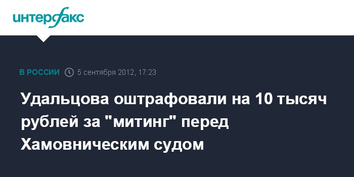 Москва. 5 сентября. INTERFAX.RU - Мировой участок Хамовнического суда Москвы в среду оштрафовал на 10 тыс. рублей координатора "Левого Фронта" Сергея Удальцова за акцию во время оглашения приговора участницам панк-группы Pussy Riot.