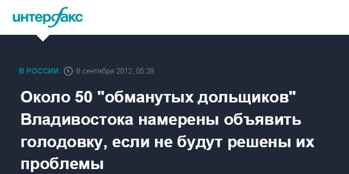 Владивосток. 6 сентября. ИНТЕРФАКС-ДАЛЬНИЙ ВОСТОК - Около 50 участников долевого строительства дома N2 по улице Кипарисовой во Владивостоке, лишившиеся денег и жилья, намерены объявить голодовку, если в ближайшее время власти Приморья не отреагируют на их проблему.