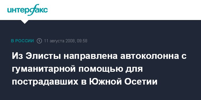 Элиста. 11 августа. INTERFAX.RU - Из Элисты (Калмыкия) во Владикавказ в воскресенье вечером отправилась автоколонна с гуманитарной помощью для пострадавших в результате боевых действий в Южной Осетии.
