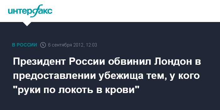 "Я говорил не с действующими руководителями правительства, но с прежними моими партнерами и друзьями, как раз указывал им на то, что в Великобритании скрываются люди, у которых руки по локоть в крови, которые реально воевали здесь, на нашей территории, с оружием в руках, людей убивали", - сказал В.Путин.
