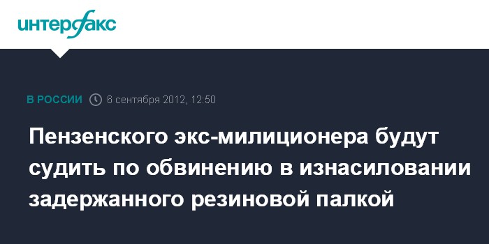 Пенза. 6 сентября. ИНТЕРФАКС-ПОВОЛЖЬЕ - Перед судом в Пензенской области предстанет бывший заместитель начальника отделения участковых уполномоченных милиции ОВД Городищенского района, обвиняемый в сексуальном надругательстве над задержанным.