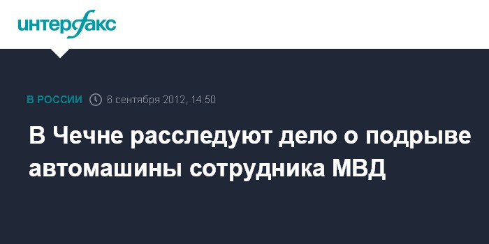 Москва. 6 сентября. INTERFAX.RU - В Чечне возбуждено уголовное дело по факту подрыва в автомобиле сотрудника МВД, сообщили "Интерфаксу" в СК РФ.