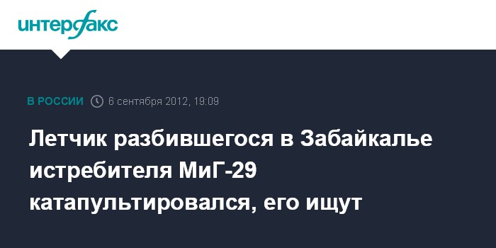 Москва. 6 сентября. INTERFAX.RU - Истребитель МиГ-29 ВВС России разбился в районе населенного пункта Домна в Забайкальском крае, летчик катапультировался, но судьба его неизвестна, информирует Минобороны РФ.