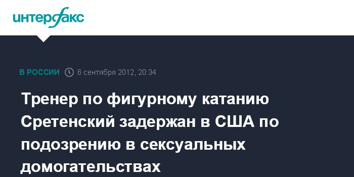 Вашингтон. 6 сентября. INTERFAX.RU - Задержанный в американском штате Мэриленд тренер по фигурному катанию, мастер спорта СССР международного класса Генрих Сретенский отрицает выдвинутые против него обвинения в сексуальных домогательствах, сообщает в четверг американская газета The Washington Post. "Он полностью отрицает все выдвинутые против него обвинения. Он очень уважаемый тренер в мире фигурного катания", - приводит издание слова адвоката Сретенского Рене Сандлера.