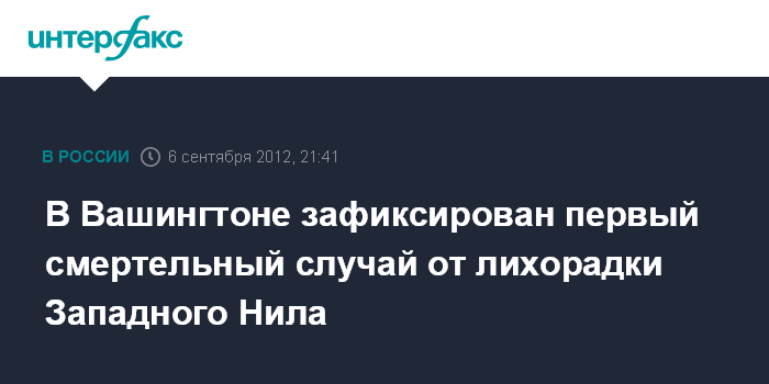 Вашингтон. 6 сентября. INTERFAX.RU - В столице США Вашингтоне в среду был зафиксирован первый летальный исход, вызванный вирусом Западного Нила, сообщили в местной службе здравоохранения.