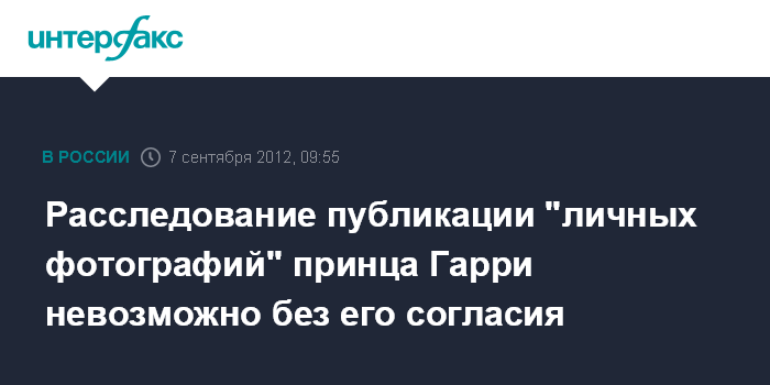 Лондон. 7 сентября. INTERFAX.RU - Невозможно начать расследование публикации "личных фотографий" принца Гарри британской газетой The Sun без его согласия, заявила Комиссия по жалобам на прессу Великобритании.