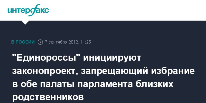 Москва. 7 сентября. INTERFAX.RU - На сайте "Единой России" размещен проект закона, направленный против семейственности в российском парламенте.