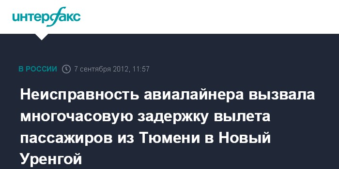 Салехард. 7 сентября. INTERFAX.RU - Рейс Тюмень - Новый Уренгой авиакомпании "Ютэйр" задерживается на пять с половиной часов из-за технической неисправности самолета, следует из данных он-лайн табло аэропортов Тюмени и Нового Уренгоя.