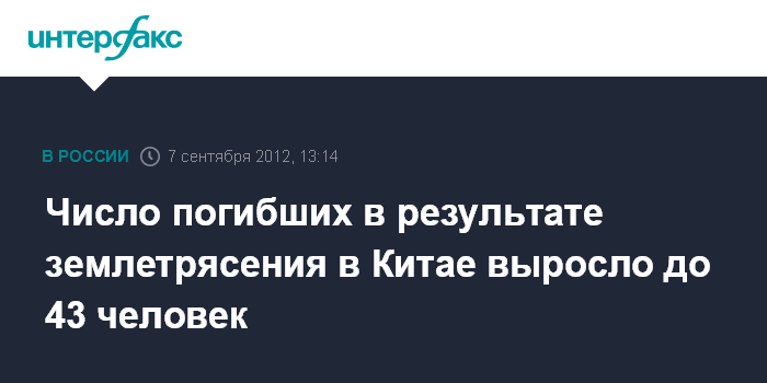 Пекин. 7 сентября. INTERFAX.RU - Число жертв землетрясения на юго-западе Китая возросло до 43 человек, еще более 150 человек получили ранения различной степени тяжести, сообщили СМИ с места события.