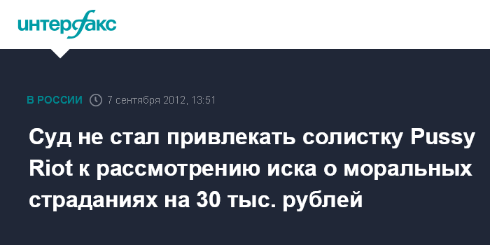 Суд не стал привлекать солистку Pussy Riot к рассмотрению иска о моральных страданиях на 30 тыс. рублей