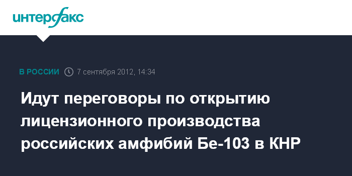 Геленджик. 7 сентября. INTERFAX.RU - Россия планирует поставить Китаю очередную партию самолетов-амфибий Бе-103, и наладить там их лицензионное производство, сообщил гендиректор ТАНТК имени Бериева Виктор Кобзев.