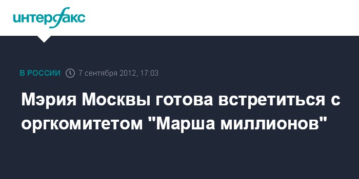 Москва. 7 сентября. INTERFAX.RU - В мэрии Москвы готовы встретиться с оргкомитетом "Марша миллионов" для обсуждения предстоящей акции.