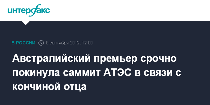 Канберра. 8 сентября. INTERFAX.RU - Премьер-министр Австралии Джулия Гиллард была вынуждена в субботу экстренно покинуть саммит АТЭС во Владивостоке и вернуться на родину в связи с кончиной своего отца, сообщили местные СМИ.