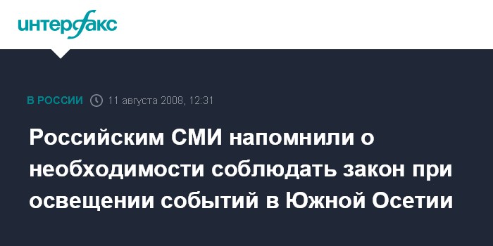 В связи с событиями в Южной Осетии Россвязькомнадзор обращает внимание редакций на необходимость неукоснительного соблюдения ст. 4 закона РФ о СМИ в части недопущения использования СМИ "для распространения экстремистских материалов, в которых, в частности, могут содержаться признаки возбуждения социальной, расовой, национальной или религиозной розни, пропаганды исключительности, превосходства или неполноценности человека по признаку его социальной, расовой, национальной, религиозной или языковой принадлежности или отношения к религии".