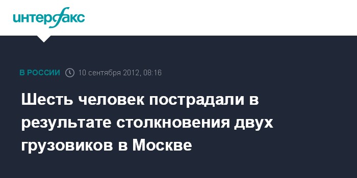 Москва. 10 сентября. INTERFAX.RU - Шесть человек пострадали в результате ДТП с участием двух грузовиков на севере Москвы, сообщил "Интерфаксу" источник в правоохранительных органах в ночь на понедельник.