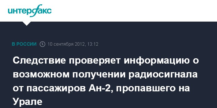 Екатеринбург. 10 сентября. INTERFAX.RU - Житель города Нижнего Тагила (Свердловская область) предоставил следствию запись радиосигнала, который, возможно, поступил от пропавших три месяца назад пассажиров самолета Ан-2, сообщает в понедельник пресс-служба Уральского следственного управления на транспорте СКР.