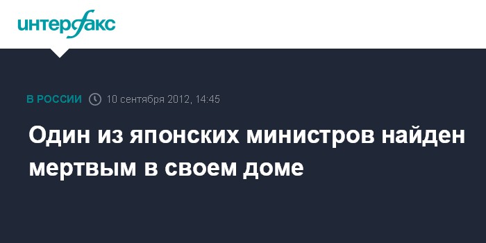 Токио. 10 сентября. INTERFAX.RU - Министр по делам финансовых услуг и почтовой реформы Японии Тадахиро Мацусита обнаружен мертвым в собственном доме в Токио, сообщила в понедельник японская газета "Майнити симбун".