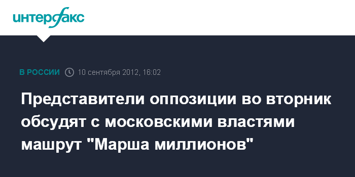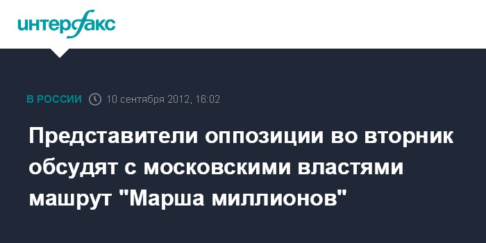 Оппозиция подала в мэрию Москвы заявку на проведение 15 сентября шествия от Белорусского вокзала по Тверской до Боровицкой площади, где должен состояться митинг.